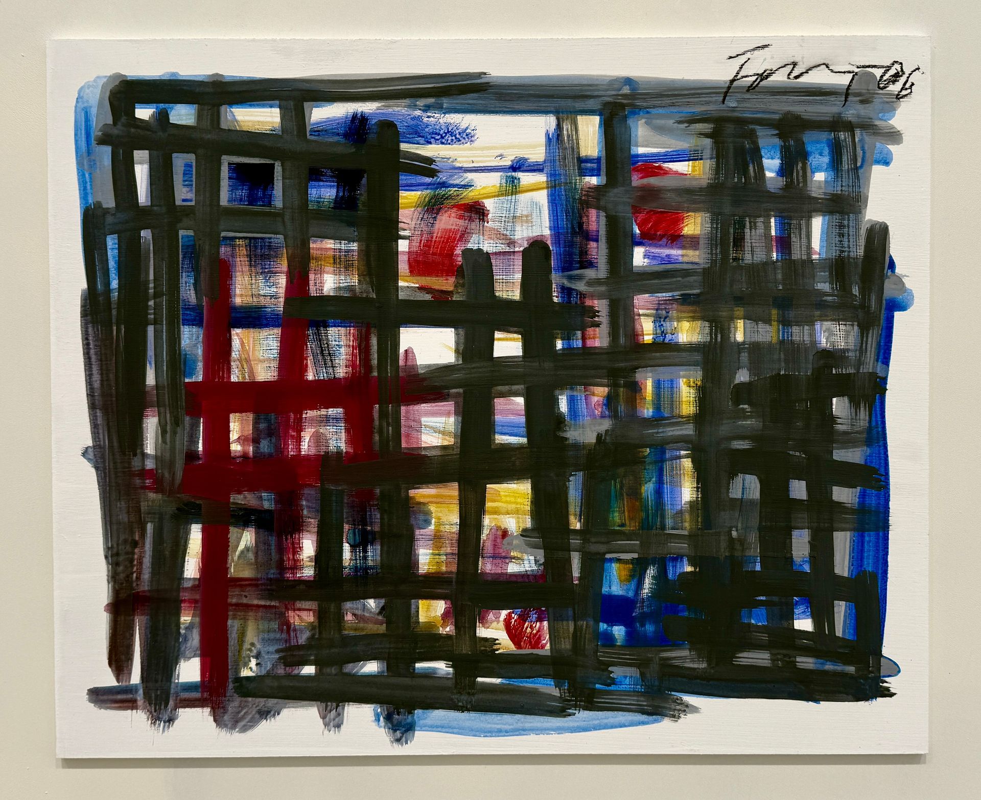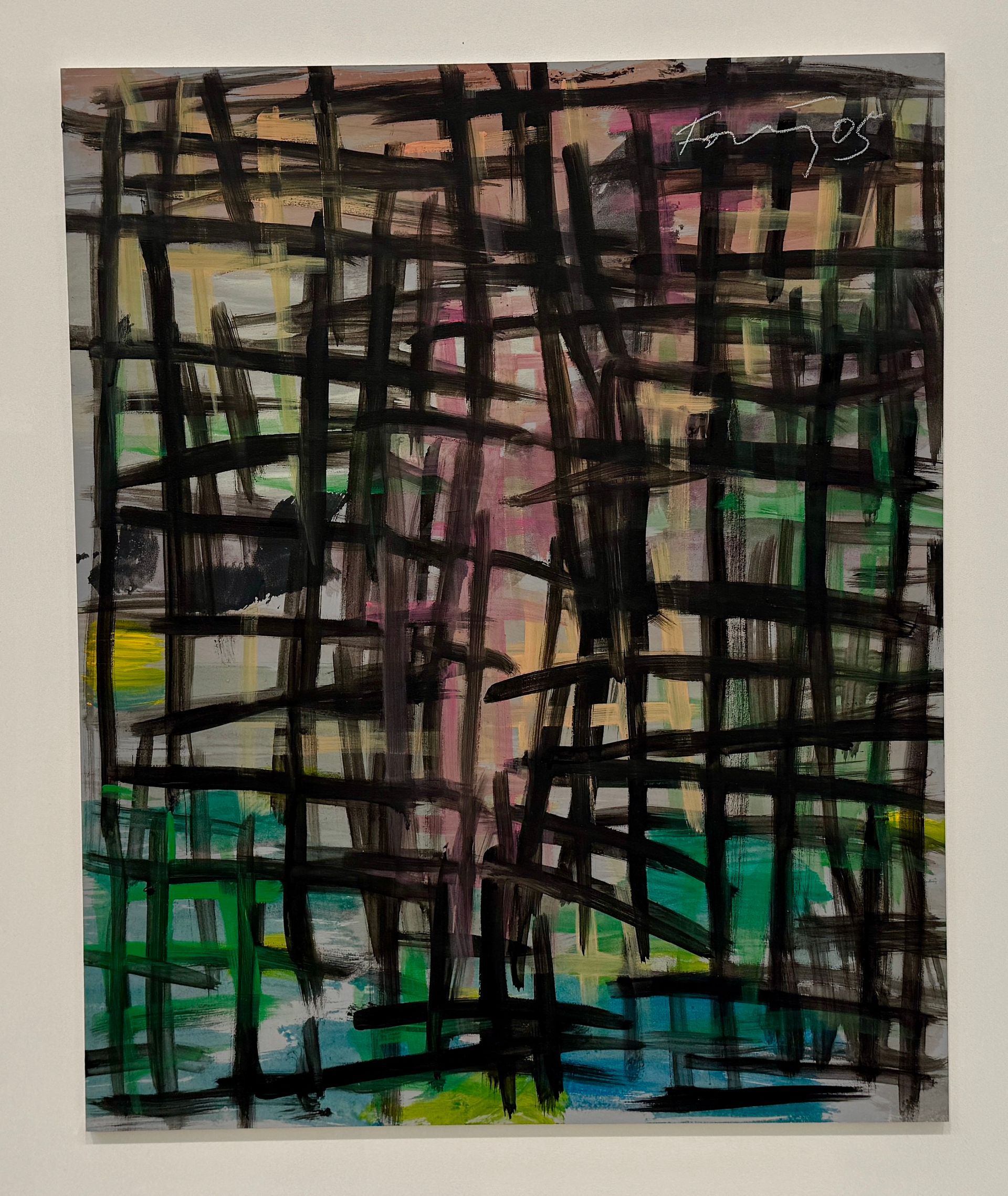 Smaller acrylic on wood panel pieces by Förg are lined up on an opposite wall. These clear and clean grid pieces feel more like drawings than paintings. The effect is layered, with the darker grid in front, half-concealing color movements and shapes behind. The front grid is heavy enough to become a barrier between the viewer and the background painting. Even though Förg used a consistent grid formula for the panels, each has a unique feel.