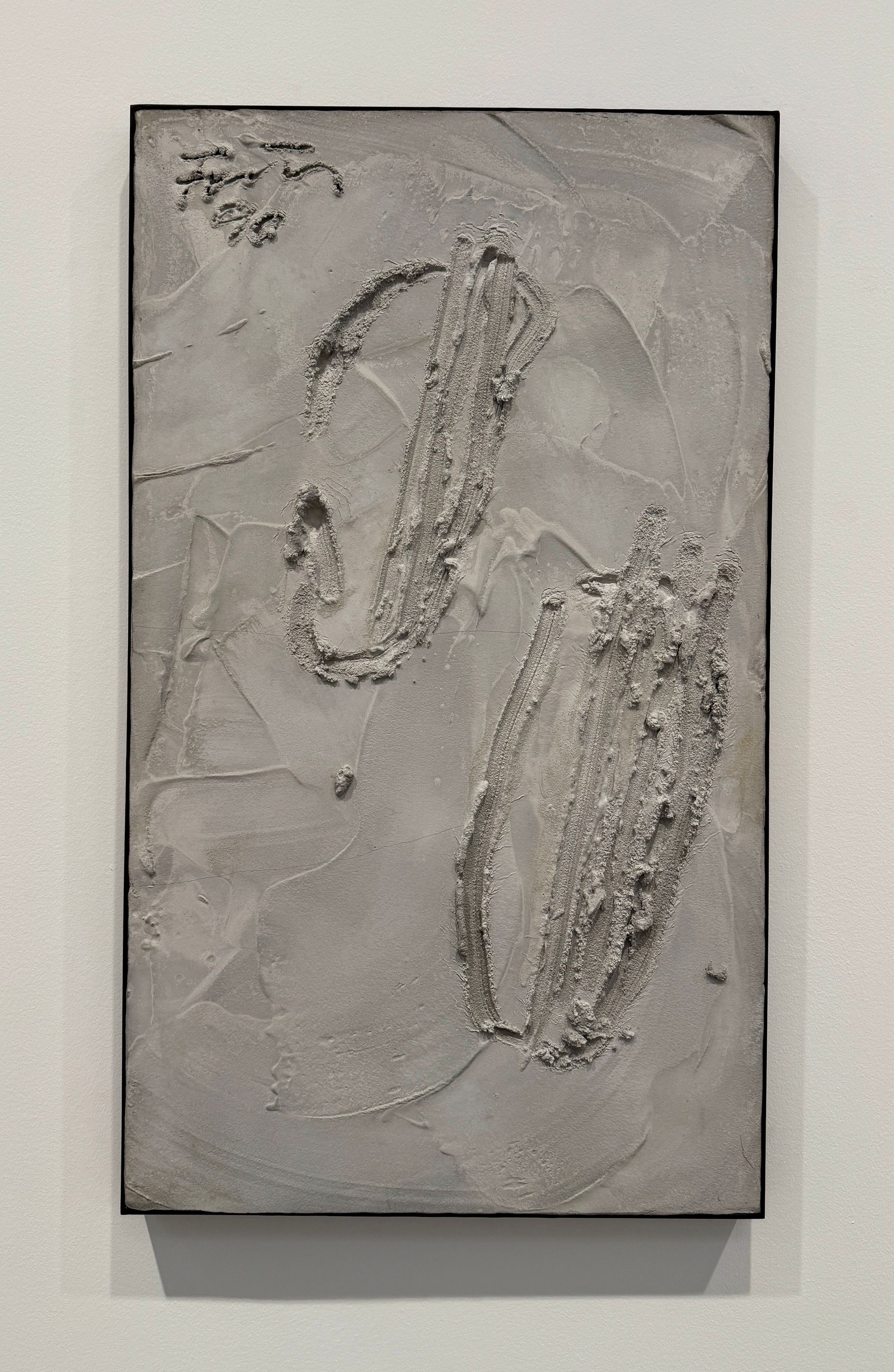 On the second floor the exhibit continues with smaller works by both artists. Most interesting were what I’m calling “sand drawings,” by Förg. They look like drawings made in wet sand; however, they are made of concrete. The pieces vary from grid form to curvy calligraphy. Also interesting are the smaller, wall-mounted sculptures by Josephsohn. They follow a similar theme as the large column figures on the first floor, except these abbreviated pieces portray not just one figure, but a dimly visible narrative. The subjects have been almost complete worn away by the erosion of time (millennia?). The pieces are so dark that the viewer has to allow time for eye adjustment in order to actually see the forms that emerge from the wall - time well spent.